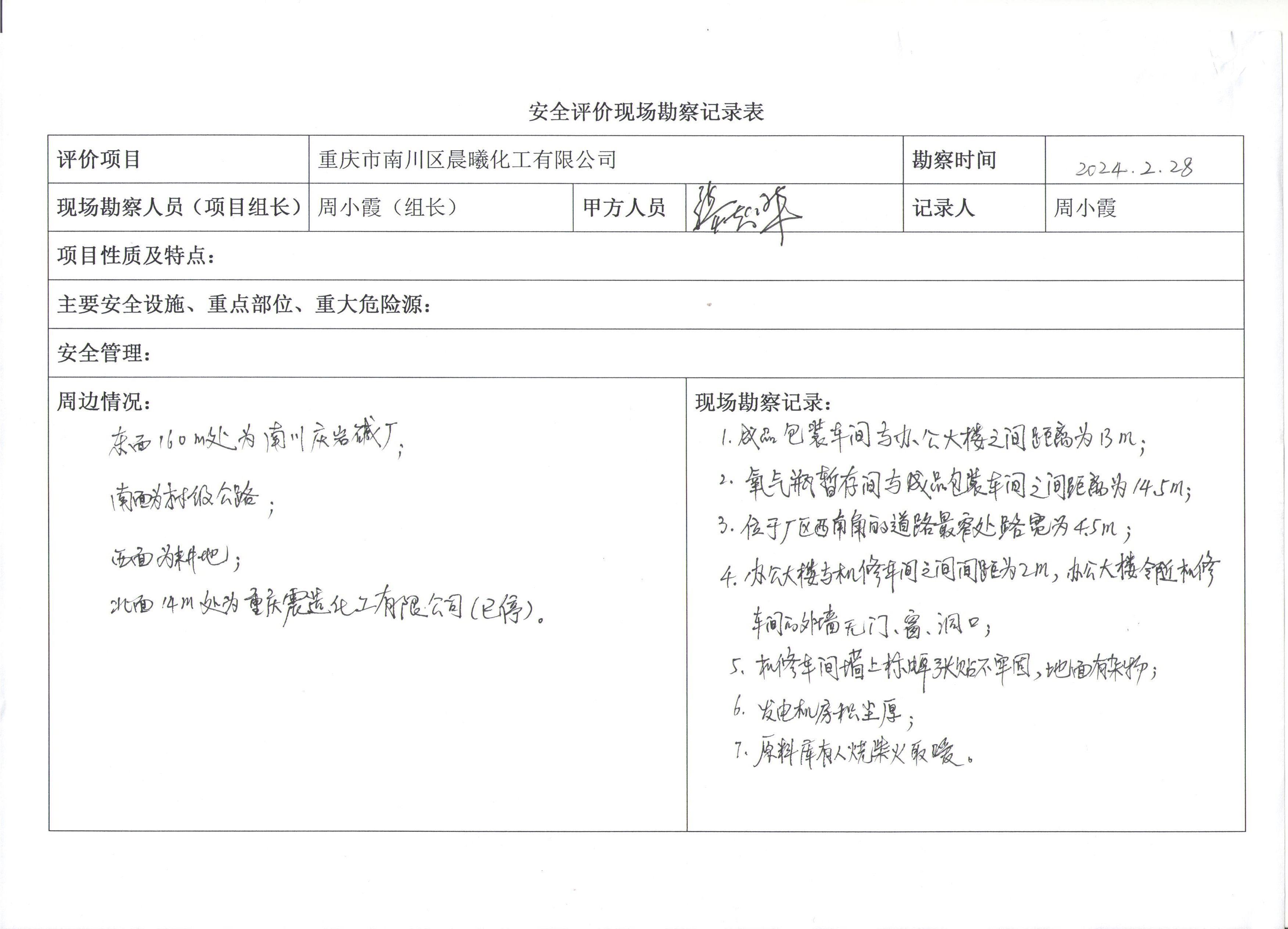 項目名稱 | 重慶市南川區(qū)晨曦化工有限公司安全現(xiàn)狀評價 | 合同編號 | DA(渝)-PJ-20240206 | |||||